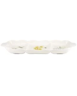 - Crafted from dishwasher and microwave-safe durable white ceramic porcelain, the Butterfly Meadow 16inDivided Serving Dish features a scalloped rim and dragonfly reliefs on either handle. A different garden design plays out within each of the serving dish’s three sections.
