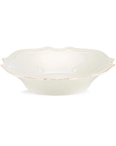 - An intricate tea-stained rim with soft scalloping is the focal point of this durable white ceramic stoneware pasta serving bowl, that also features gentle enamel beads patterned along the inner border. This item is microwave and dishwasher-safe, for added convenience.