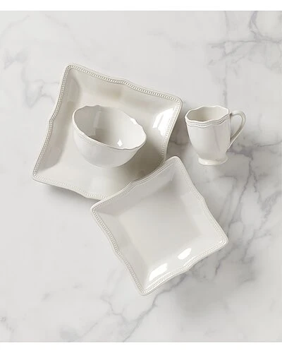 - With a subtle square shape, tea-stained scalloped edges, and raised dots, this four-piece place setting is as whimsical as it is elegant, and elevates a casual dinner to a more formal affair. This durable ceramic stoneware item is microwave and dishwasher-safe, for added convenience.