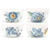 - This set of four assorted durable white ceramic stoneware dessert plates, in assorted shapes and patterns, includes scalloped borders with a hand-applied tea stain accent, and beads that scroll and swirl about the edges and interior. This item is microwave and dishwasher-safe, for added convenience.