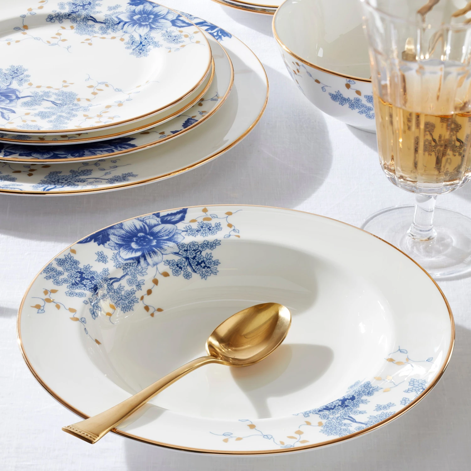 A blue toile-inspired floral pattern dips from the edges to the base of this Garden Grove Rimmed 9ö Soup Bowl. Made of durable white bone china, with delicate gold botanical accents and a 24-karat gold trim, this dishwasher-safe bowl ensures family traditions are best served warm.