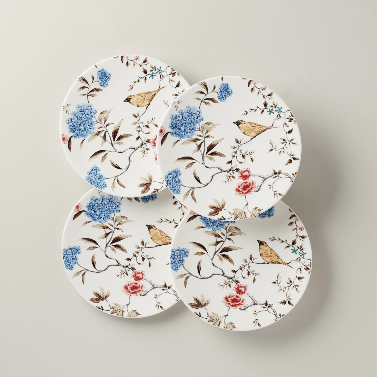 Open your home to a lush English garden with the Sprig & Vine collection. Inspired by the beauty of vintage textiles, this set of four accent plates combines birds and bright botanicals for a backyard aesthetic that will bring new life to your table. A sliver of metallic adds a gleaming touch to give this floral set its golden finish.