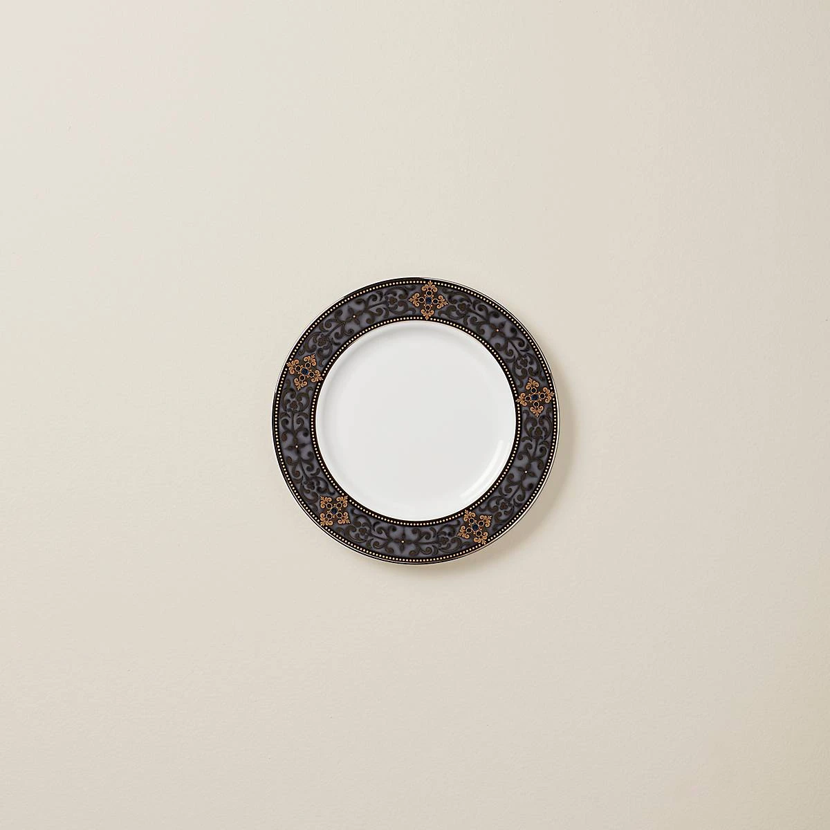 This Vintage Jewel salad plate, made of durable white bone china, features an ornate black-and-gold pattern of scrollwork along its border, as well as accents of 24-karat gold and precious platinum. The enamel dots gives the piece a fine texture. This item is dishwasher-safe, for added convenience.