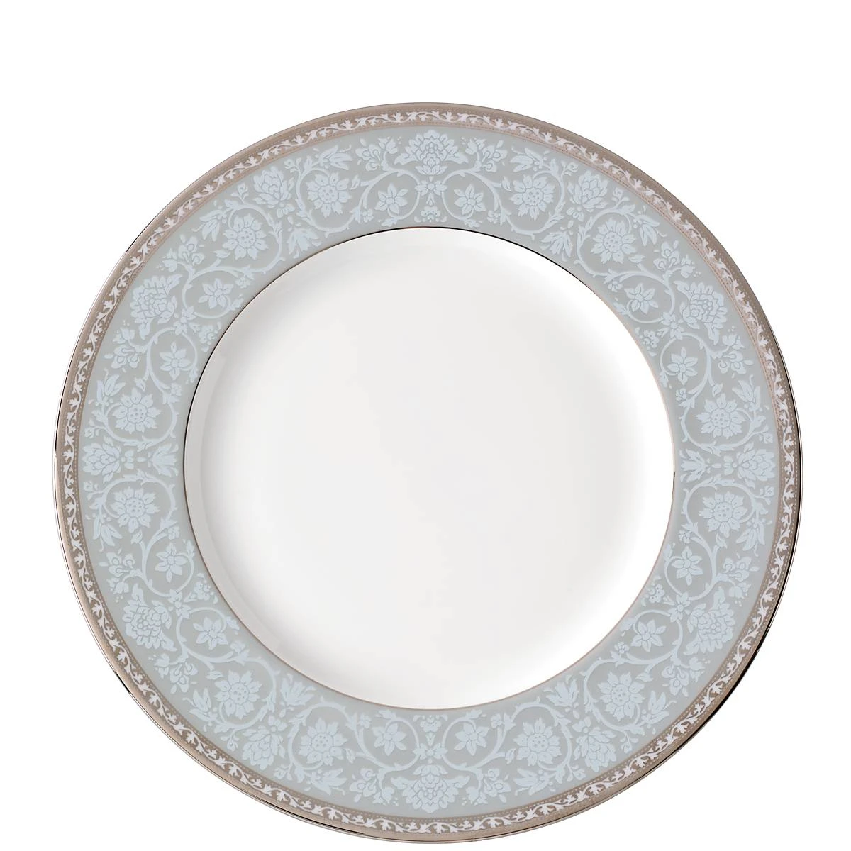 A lace floral pattern decorates this sky blue-bordered accent plate, crafted of durable bone china, that features a fine trim of precious platinum along the outside border, for a subtle gleam. This item is dishwasher-safe, for added convenience.